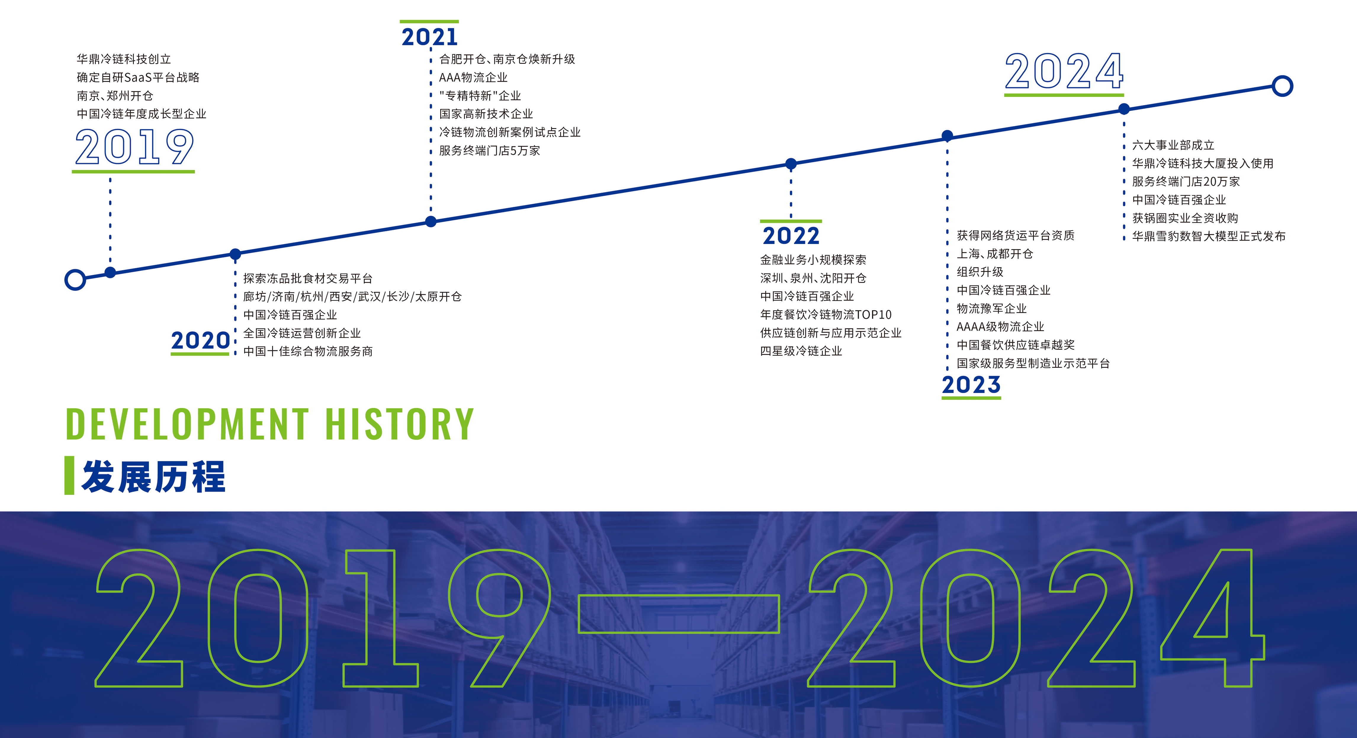 截至目前, 华鼎冷链科技在全国已经有45个省级中心仓, 仓储面积60万平方, 干支线网络125000条, 辐射全国除港澳台以外的全部省区, 290个地级市、2800个县, 通过华鼎自主研发的SAAS系统, 已连接食材工厂、连锁餐饮品牌、经销商等2500余家, 服务餐饮终端门店400000余家, 并先后荣获 “国家服务型制造业示范平台 ”、“中国冷链百强企业 ”、“高新技术企业 ”、“专精特新企业 ”、“全国冷链运营创新企业 ”、 “四星级冷链物流企业 ”、“河南省冷冻食材数字化供应链示范平台 ”等国家和行业荣誉,并参与国家城乡高效配送服务标准的制定。